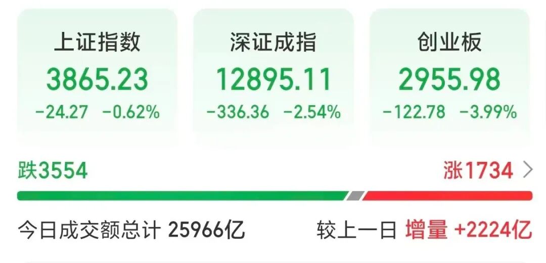 今日,A股市场震荡回调。截至收盘,上证指数跌0.62%,深证成指跌2.54%,创业板指跌3.99%。市场全天成交额超2.59万亿元,较上一交易日增加2224亿元。