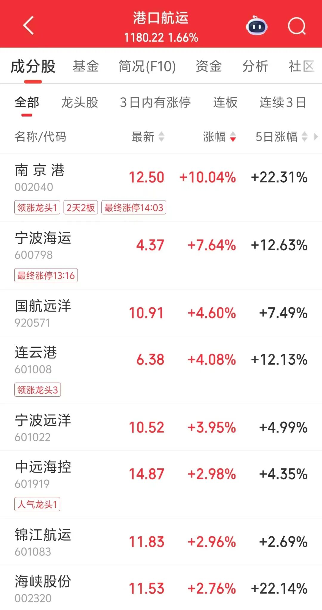 港口航运板块逆势走强。南京港午后开盘“秒”涨停,随后短暂开板后再度涨停,实现两连板,宁波海运、国航远洋等跟涨。