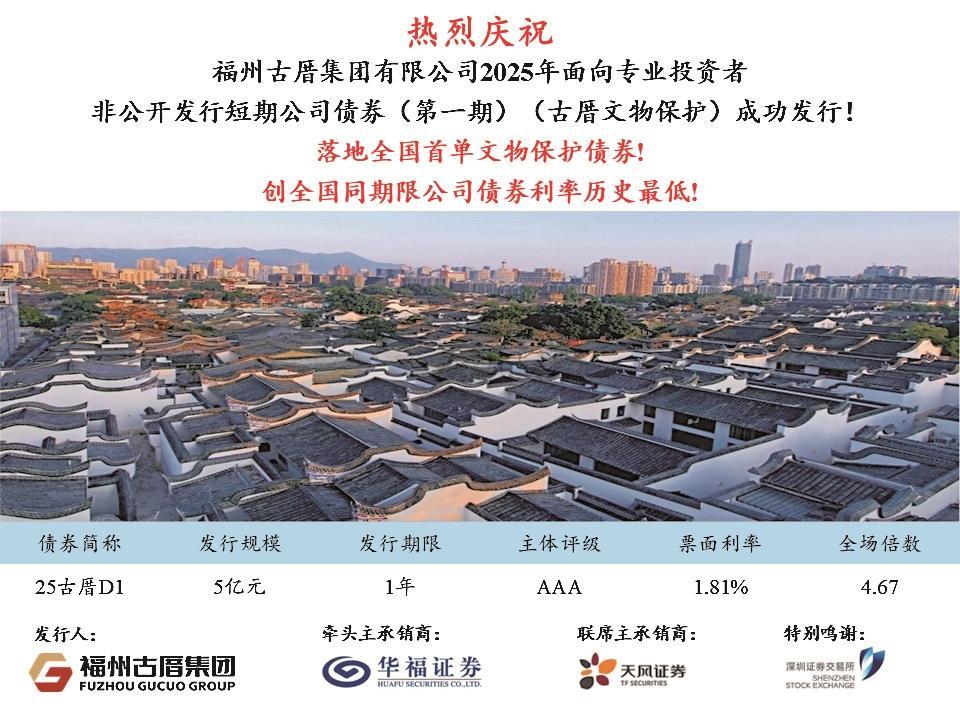 2025年5月15日,华福证券担任牵头主承销商协助发行人成功簿记全国首单文物保护债券,助力福建文旅事业高质量发展。