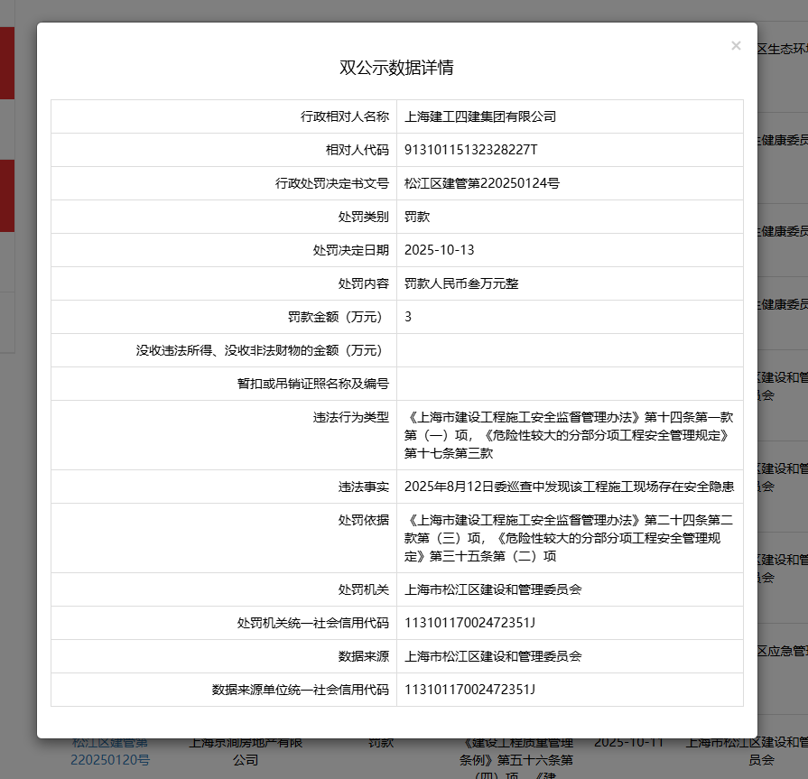 近日,齐鲁晚报·齐鲁壹点记者从信用中国(上海)获悉,上海建工四建集团有限公司因工程施工现场存在安全隐患,被上海市松江区建设和管理委员会罚款3万元。