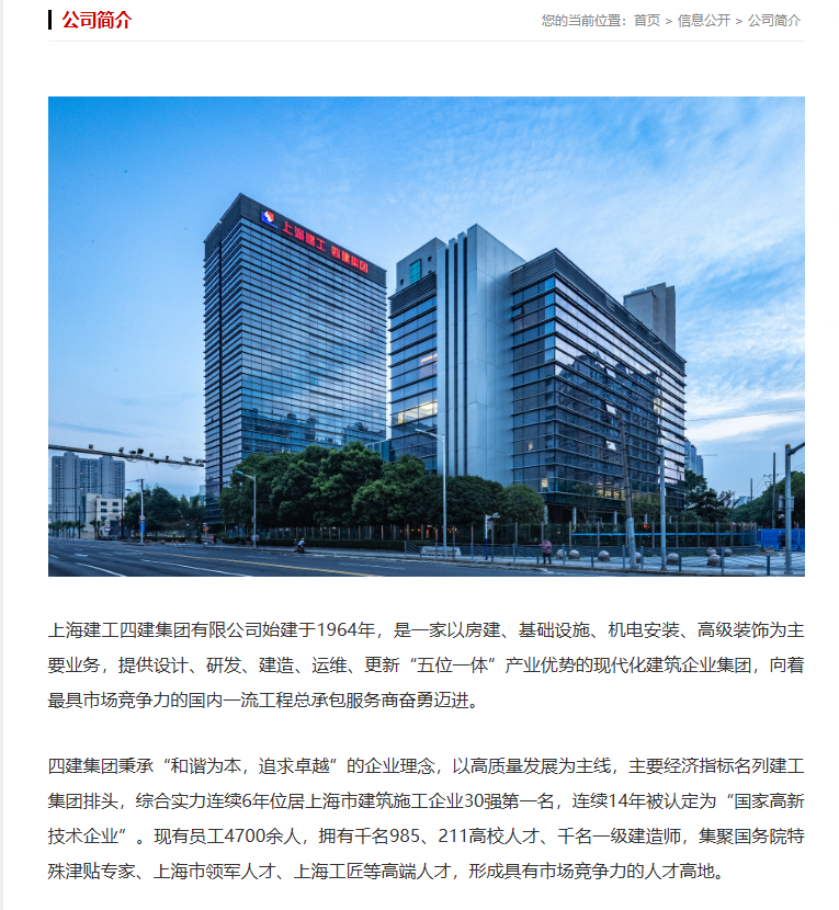 上海建工四建集团有限公司始建于1964年,是一家以房建、基础设施、机电安装、高级装饰为主要业务,提供设计、研发、建造、运维、更新“五位一体”产业优势的现代化建筑企业集团。是上海建工(600170.SH)全资子公司。