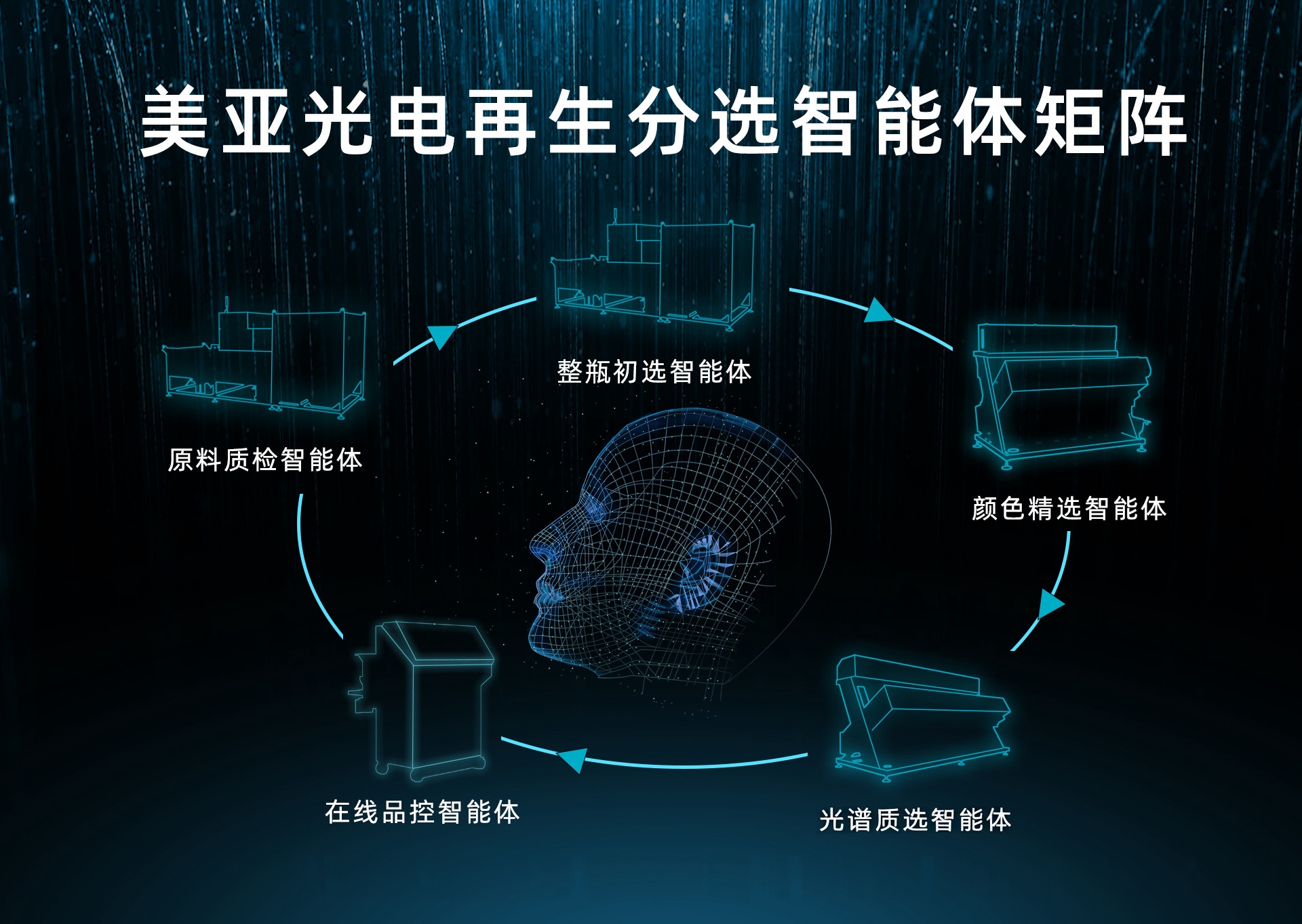 面对这一全球性挑战,美亚光电以十余年行业积淀为基石,融合AI、大数据与物联网等前沿科技,推出业界首个覆盖再生塑料全流程的“智能体矩阵”。该矩阵已在欧、美、亚三大洲成功部署数十套全场景解决方案。