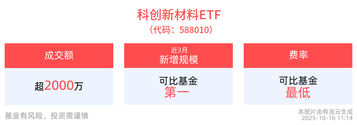 流动性方面,科创新材料ETF盘中换手7.43%,成交2078.43万元。拉长时间看,截至10月15日,科创新材料ETF近1周日均成交3161.83万元,居可比基金第一。