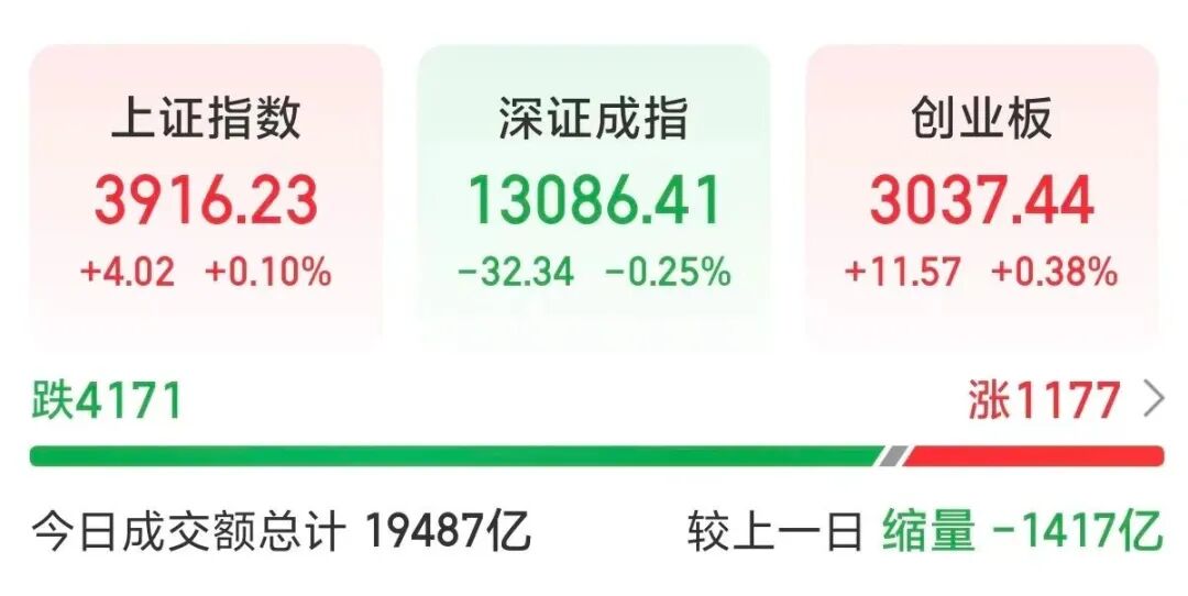 今日,A股三大指数表现分化。截至收盘,上证指数涨0.1%,深证成指跌0.25%,创业板指涨0.38%。市场全天成交额超1.94万亿元。