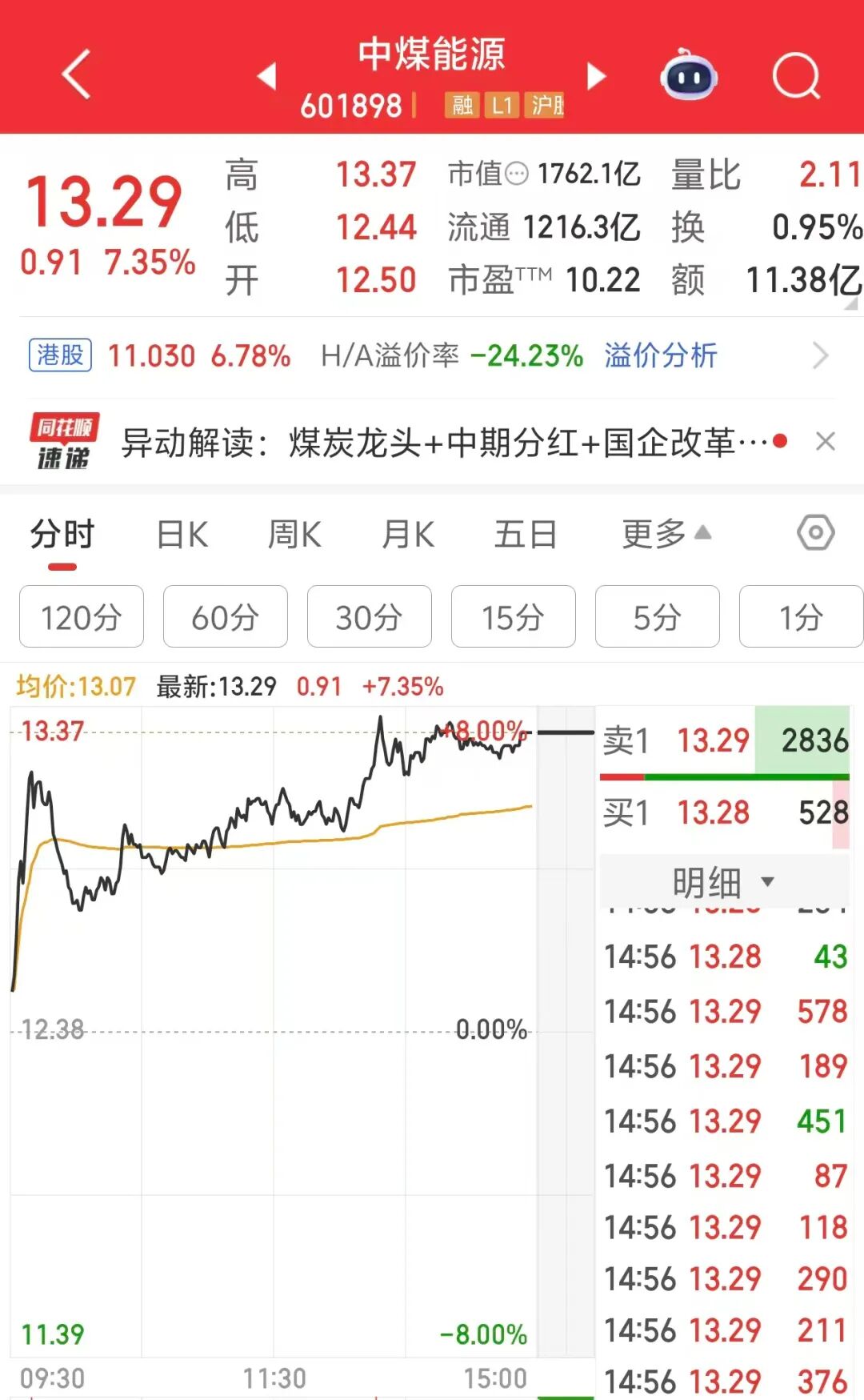 中煤能源A、H股双双大涨,A股收涨7.35%,最新总市值为1762.1亿元;H股同样涨超7%。