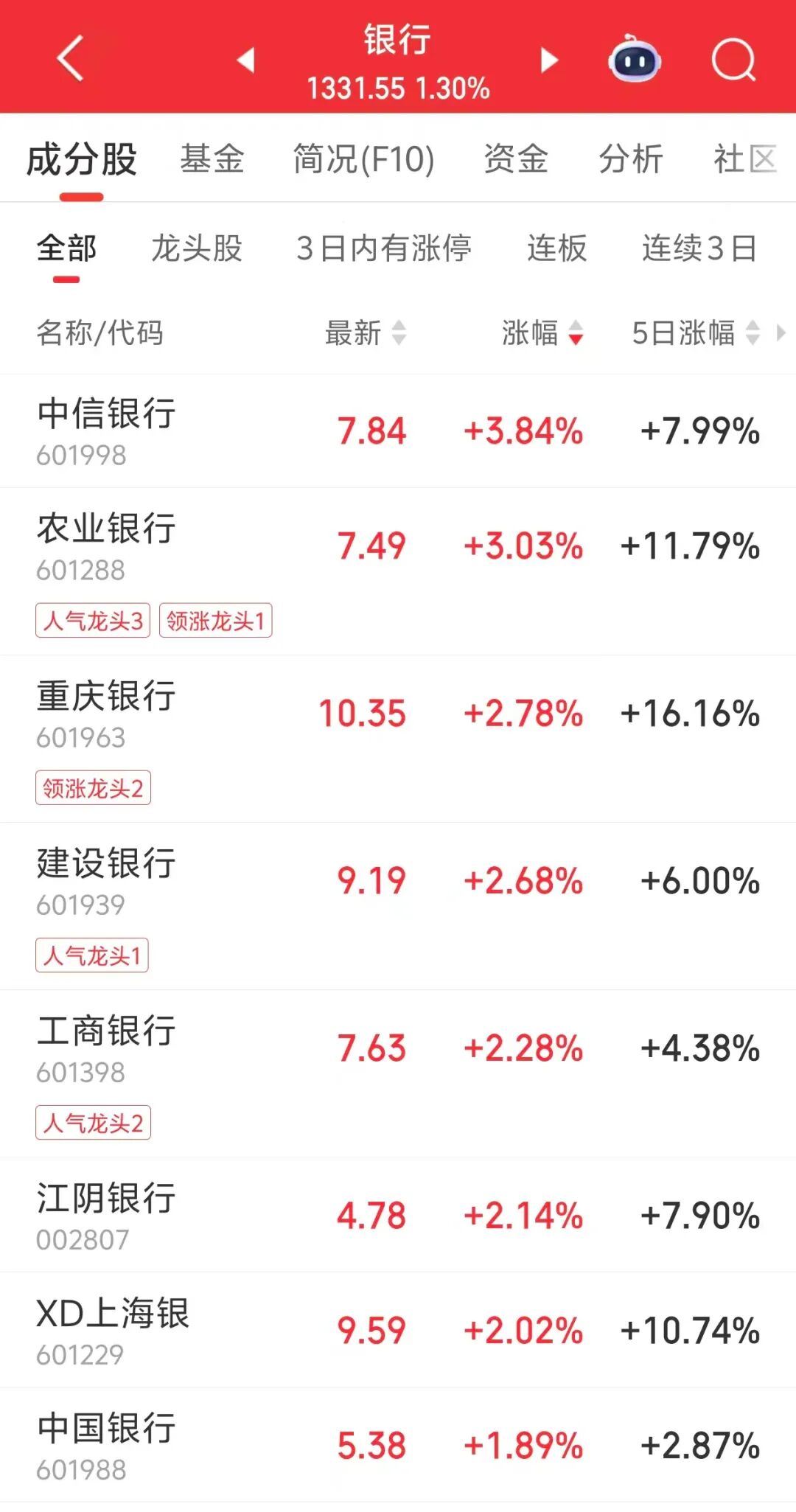 银行板块震荡拉升