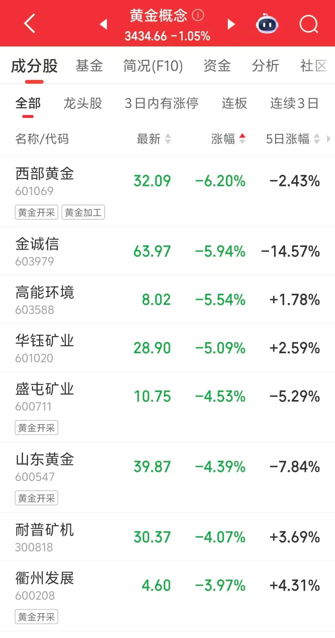 今日上午,黄金股冲高回落,午后继续回调。西部黄金跌超6%,金诚信、高能环境跌超5%。