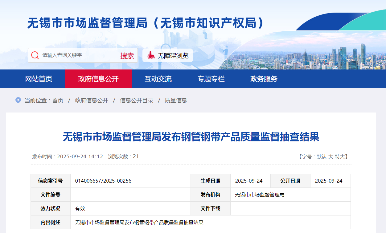 无锡市市场监督管理局发布钢管钢带产品质量监督抽查结果