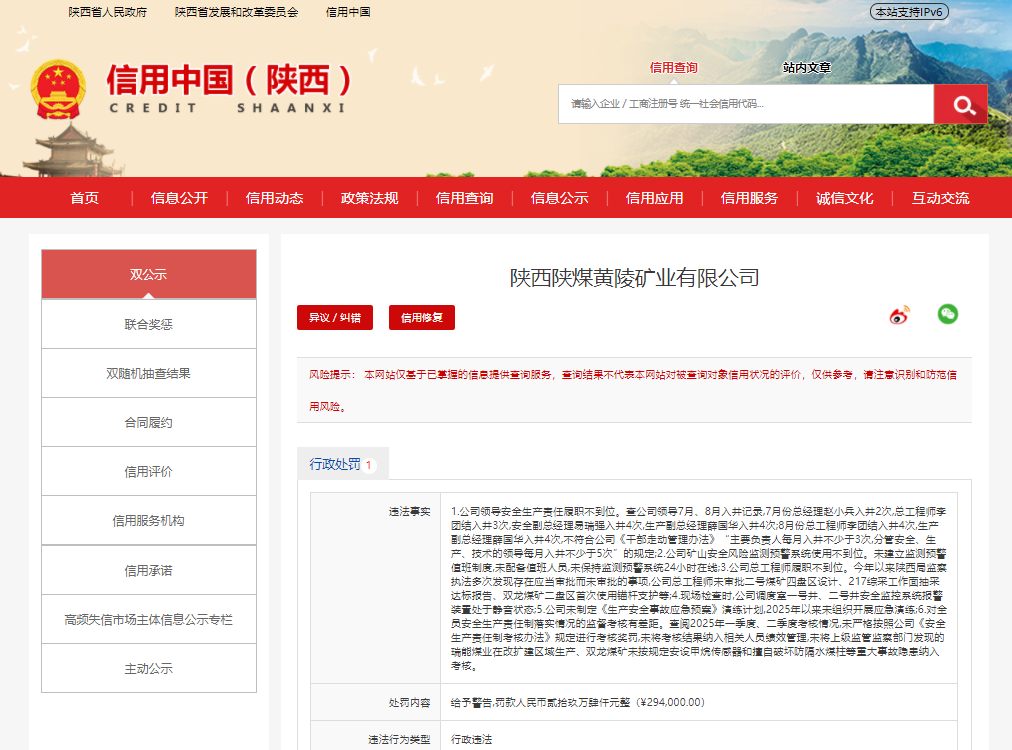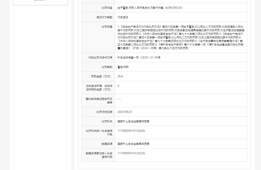 近日,国家矿山安全监察局陕西局对陕西陕煤黄陵矿业有限公司(以下简称“黄陵矿业”)依法作出行政处罚,给予警告,并合并罚款人民币贰拾玖万肆仟元整(¥294,000.00)。相关行政处罚决定书(文号:矿安监陕煤督一罚﹝2025﹞01-05号)已于2025年9月27日正式下达。