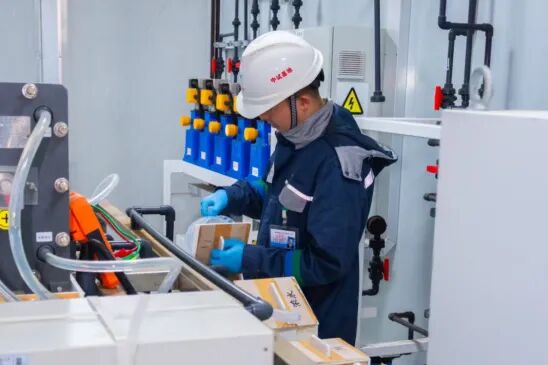 2025年,项目正式进入全面攻坚阶段。“年初我们完成35kV电缆铺设和设备通电调试,保障了全流程系统电力供应。3月启动设备调试,同步开展纳滤、反渗透和电渗析工序的试验与工艺优化。”项目组成员张荣子说,经过多轮调试,实现单级纳滤产水回收率达90%,镁截留率达98%;反渗透工段产水回收率达75%,关键指标均实现突破,展现出良好的工艺稳定性和经济性。7月,项目组开展了除硼、除硬、浓缩、沉锂等关键工艺试验。通过全流程优化和严格质量控制,最终成功制备出纯度达99.80%的电池级碳酸锂。