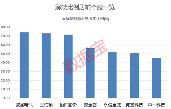 解禁比例来看,欧圣电气、三柏硕、恒帅股份等6股的解禁比例居前,均超50%。