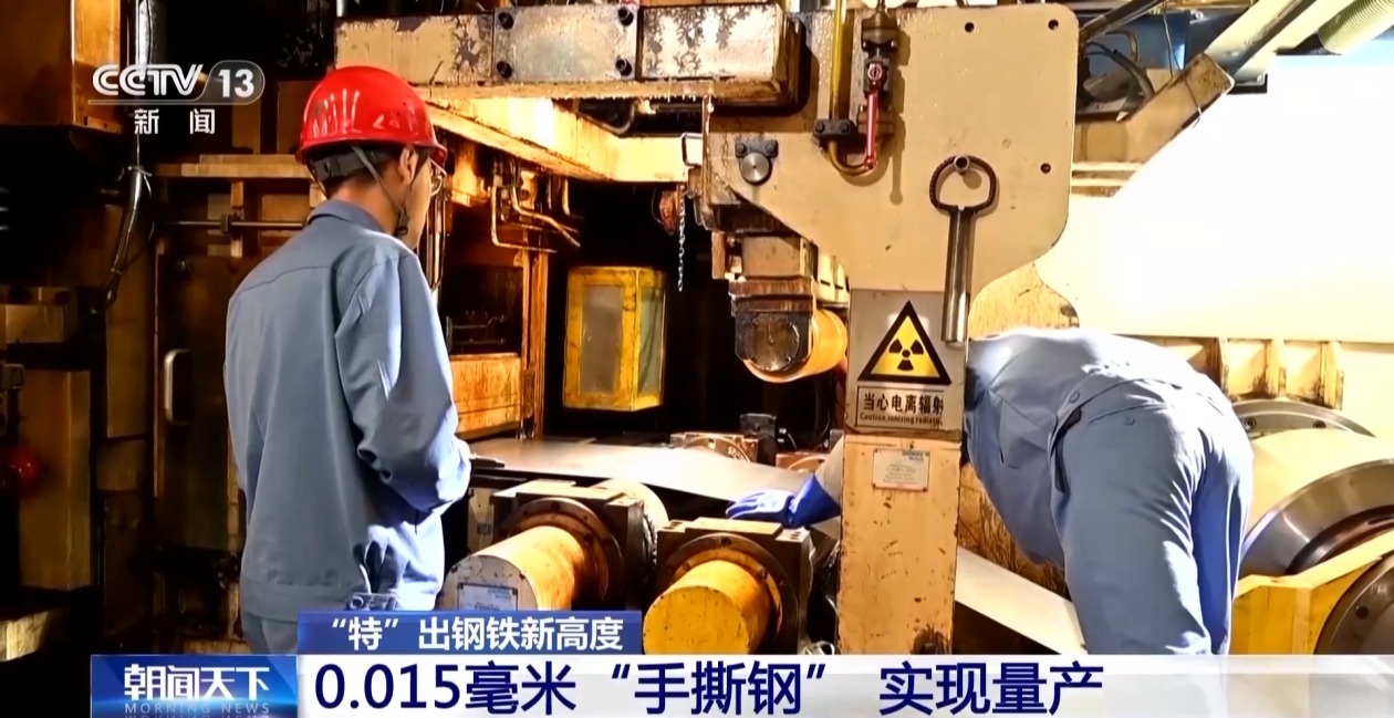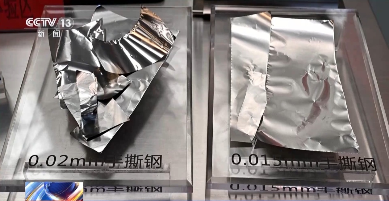 记者了解到,“手撕钢”由0.02毫米到0.015毫米的突破可不是件容易事儿。“手撕钢”的制作过程就像擀面一样,力度不够就无法擀薄,力度太大又会破坏“面皮”表面。不仅如此,它对于“面”的纯净度要求也极为苛刻,只有保证“面粉”的颗粒径降到1微米以下才能保证“擀”出来的钢不会出现穿孔、破裂。