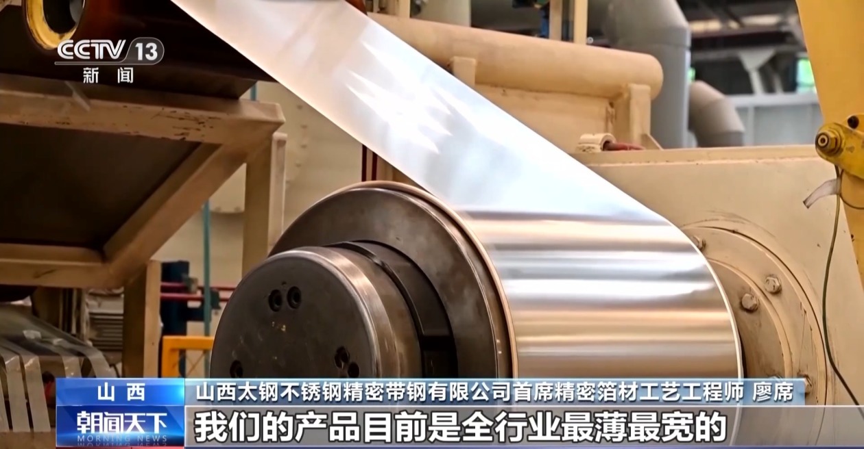 山西太钢不锈钢精密带钢有限公司首席精密箔材工艺工程师 廖席:我们的产品目前是全行业最薄最宽的,追求工艺技术的情况下,我们有更高的效率,成本也在降。量上去了大概有五六倍,成本大概降了30%左右。