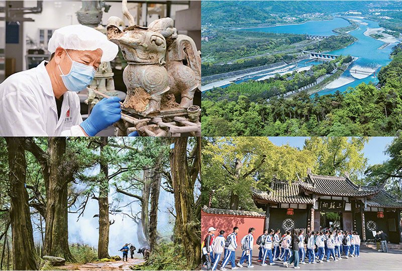四川始终坚持保护第一、传承优先,让陈列在巴蜀大地上的文化遗产焕发新的生机与活力。左上图为2023年6月,文物修复师在修复三星堆遗址8号祭祀坑出土的铜神兽。位于四川广汉的三星堆遗址,是4000多年前古蜀文明的典型代表。右上图为2025年7月拍摄的都江堰。战国时期秦国蜀郡太守李冰及其子率众在岷江上修建大型水利工程都江堰,使成都平原成为沃野千里的天府之国,为巴蜀文化发展奠定坚实基础。左下图为2024年6月拍摄的翠云廊。翠云廊作为古蜀道金牛道上的古柏苍翠大道,是中原通向西南的重要道路,建设保护跨越千年没有中断,有迄今保存最完好的人工栽植驿道古柏群。右下图为2024年10月中学生赴三苏祠开展研学活动。位于四川眉山的三苏祠是北宋著名文学家苏洵、苏轼、苏辙的故居,是历代凭吊“三苏”的文化圣地。 四川省委宣传部供图