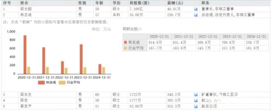 林志成2024年薪酬230.7万元,相较于2023年的700.0万元,下降了469.3万元,是公司高管中降薪最多的,也是他近五年薪酬首次低于300万元,并且低于公司两位副总经理蔡良平和陈宏。蔡良平、陈宏2024年薪酬分别为353.3万元、305.3万元,相较于2023年的500.0万元,分别下降了146.7万元、194.7万元,比林志成分别高了122.6万元、74.6万元。
