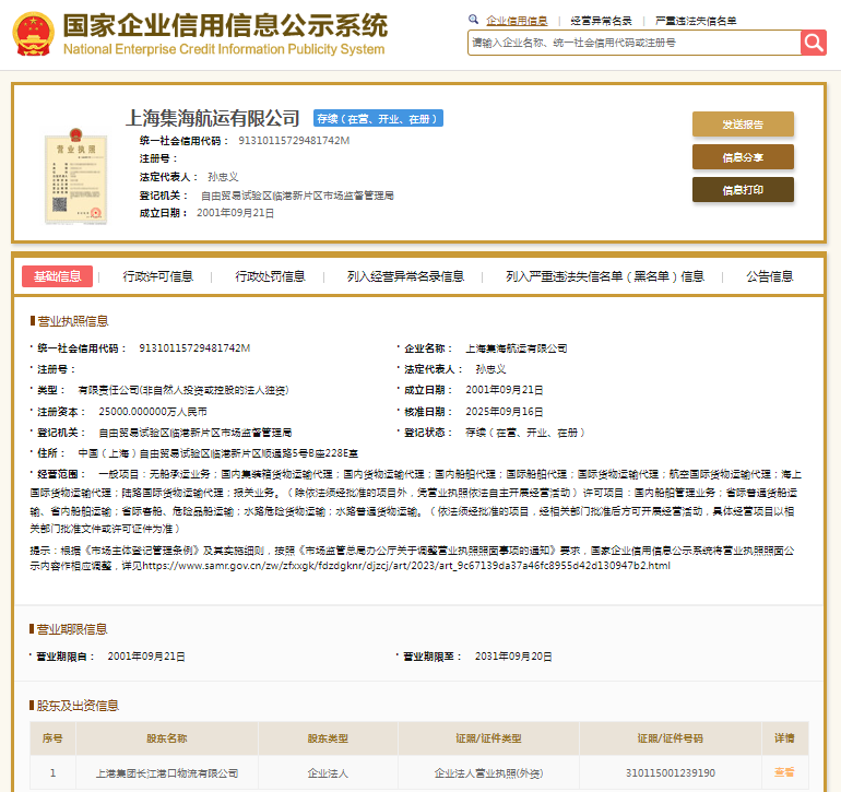 国家企业信用信息公示系统显示,上海集海航运有限公司成立于2001年,注册资本25000万元人民币,法定代表人为孙忠义,其由上港集团(600018.SH)全资子公司——上港集团长江港口物流有限公司全资持股。