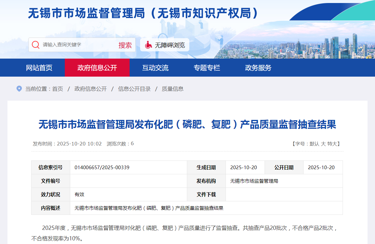 2025年度,无锡市市场监督管理局对化肥(磷肥、复肥)产品质量进行了监督抽查。共抽查产品20批次,不合格产品2批次,不合格发现率为10%。