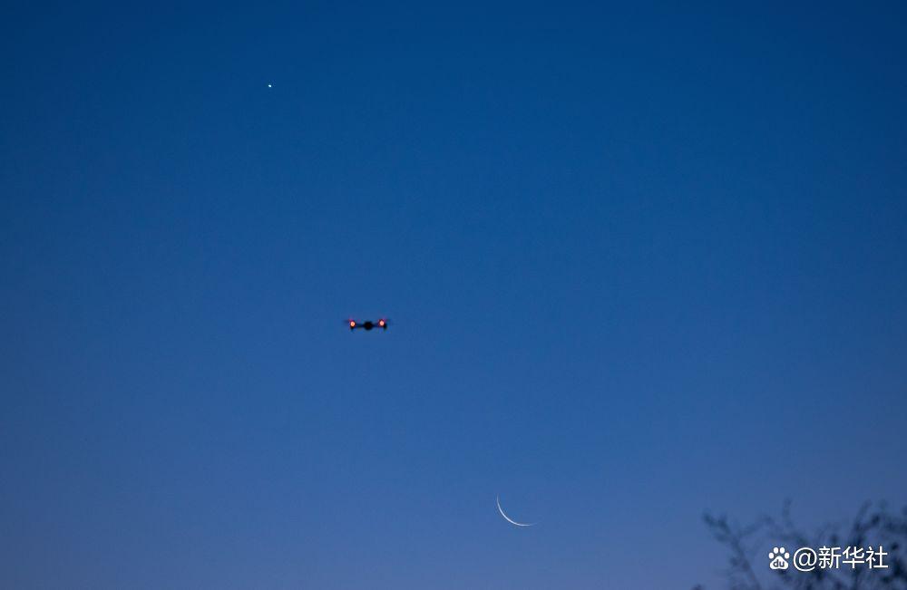 10月20日,在位于黑龙江省黑河市的北大荒集团北安分公司赵光农场有限公司,摄影爱好者在用无人机拍摄启明星伴月。新华社发(钱泊羽摄)