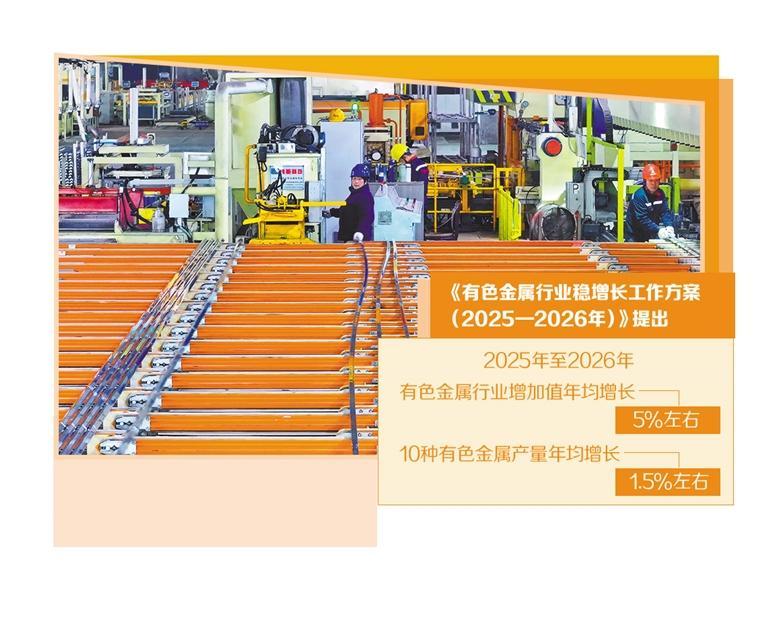 为推动有色金属行业平稳运行和转型升级,工业和信息化部等八部门近日联合印发《有色金属行业稳增长工作方案(2025—2026年)》(以下简称《方案》)。《方案》提出,2025年至2026年,有色金属行业增加值年均增长5%左右,10种有色金属产量年均增长1.5%左右,铜、铝、锂等国内资源开发取得积极进展,再生金属产量突破2000万吨,高端产品供给能力不断增强,绿色低碳、数字化发展水平持续提升。