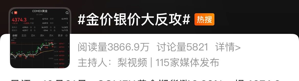 10月21日上午,现货黄金再度上涨,高至4375美元/盎司。而受市场对美联储进一步降息预期及持续避险买盘支撑,就在周一,现货黄金大涨超2%,逼近4400美元/盎司,刷出历史新高。