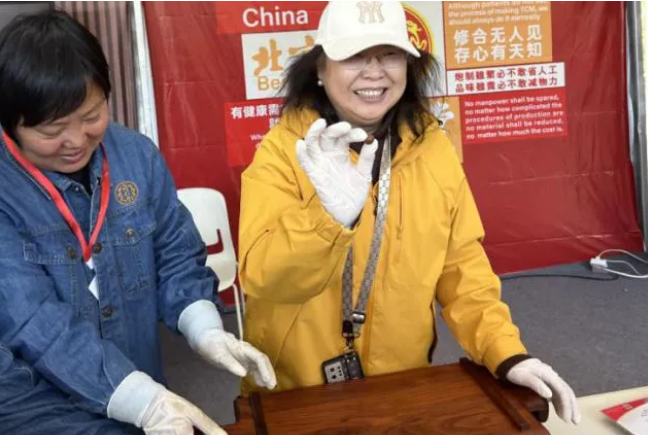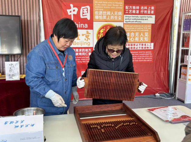 在同仁堂展位上,孔令君和徒弟陈星羽精心准备了蜜丸制作必需工具,向观众全面展示了安宫牛黄丸手工制作流程。