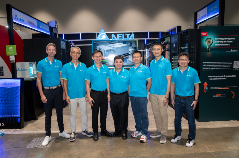 台达参与2025 OCP全球峰会,台达电源及零组件事业群执行副总裁史文景(左2)、电源及系统事业群副总裁暨总经理陈盈源(左3)、美洲区总经理曾百全(左4)、资通讯基础设施事业群副总裁暨总经理黄彦文(右3)和风扇暨热传导事业群总经理蔡明熹(右2)等主管于台达展位合影