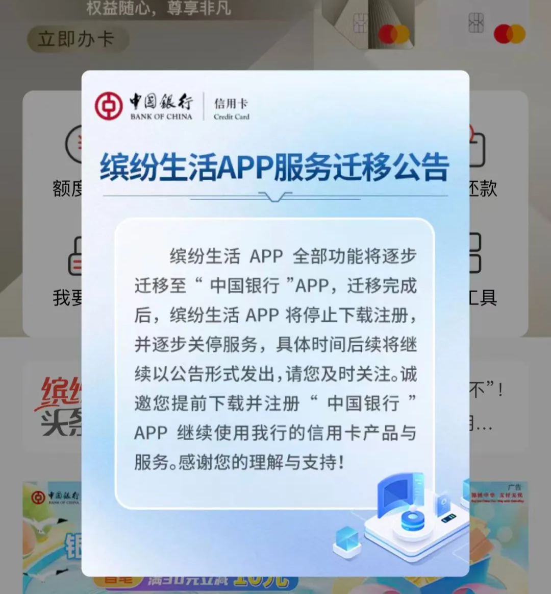 图片来源:北京银行官网中国银行已启动“缤纷生活”APP服务迁移, “缤纷生活”APP全部功能将逐步迁移至“中国银行”APP;迁移完成后,“缤纷生活”APP将停止下载注册,并逐步关停服务,具体时间后续继续以公告形式发出。