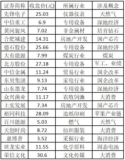 涨停板个股中,股价创出近一年新高的个股有18只(不包括创出历史新高的个股),包括先锋电子、中信重工、黄河旋风、合肥城建、德石股份、大有能源、北方股份、中信金属、东贝集团、山东墨龙、众兴菌业、上实发展、裕同科技、百川能源、天创时尚、惠博普、世龙实业、荣信文化,具体如下表所示。