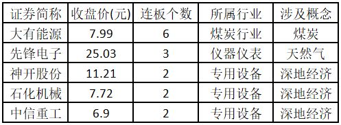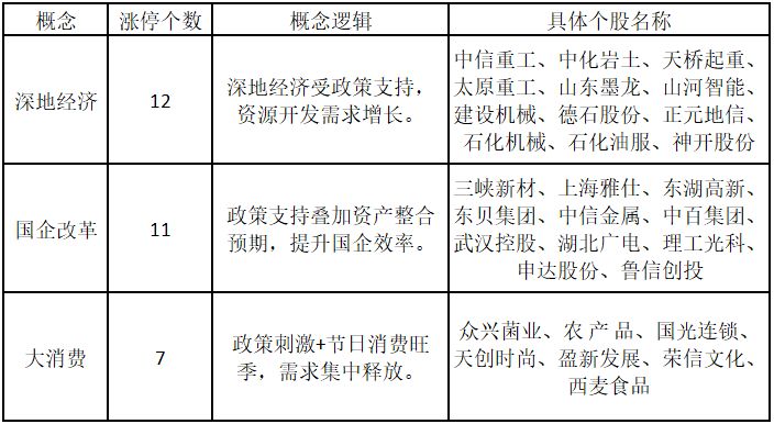 从概念特征来看,今日涨停板个股中,深地经济、国企改革、大消费概念的个股最多。