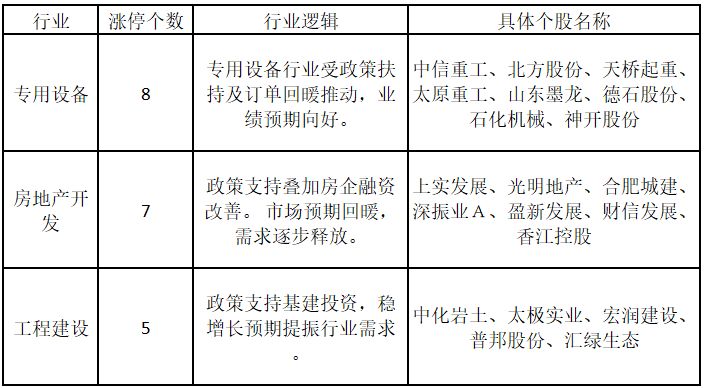 从行业特征来看,今日涨停板个股中,专用设备、房地产开发、工程建设行业的个股最多。