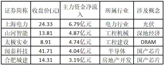 从主力资金来看,今日涨停板个股中,主力资金净流入金额排名前5的个股分别为上海电力、山河智能、太极实业、闻泰科技、合肥城建。