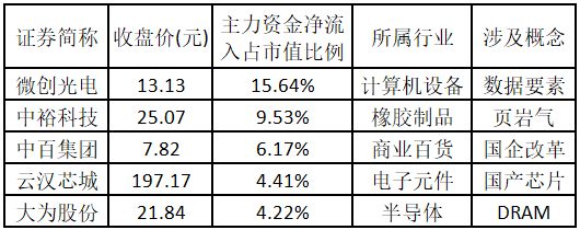 主力资金净流入金额占市值比例排名前5的个股分别为微创光电、中裕科技、中百集团、云汉芯城、大为股份。