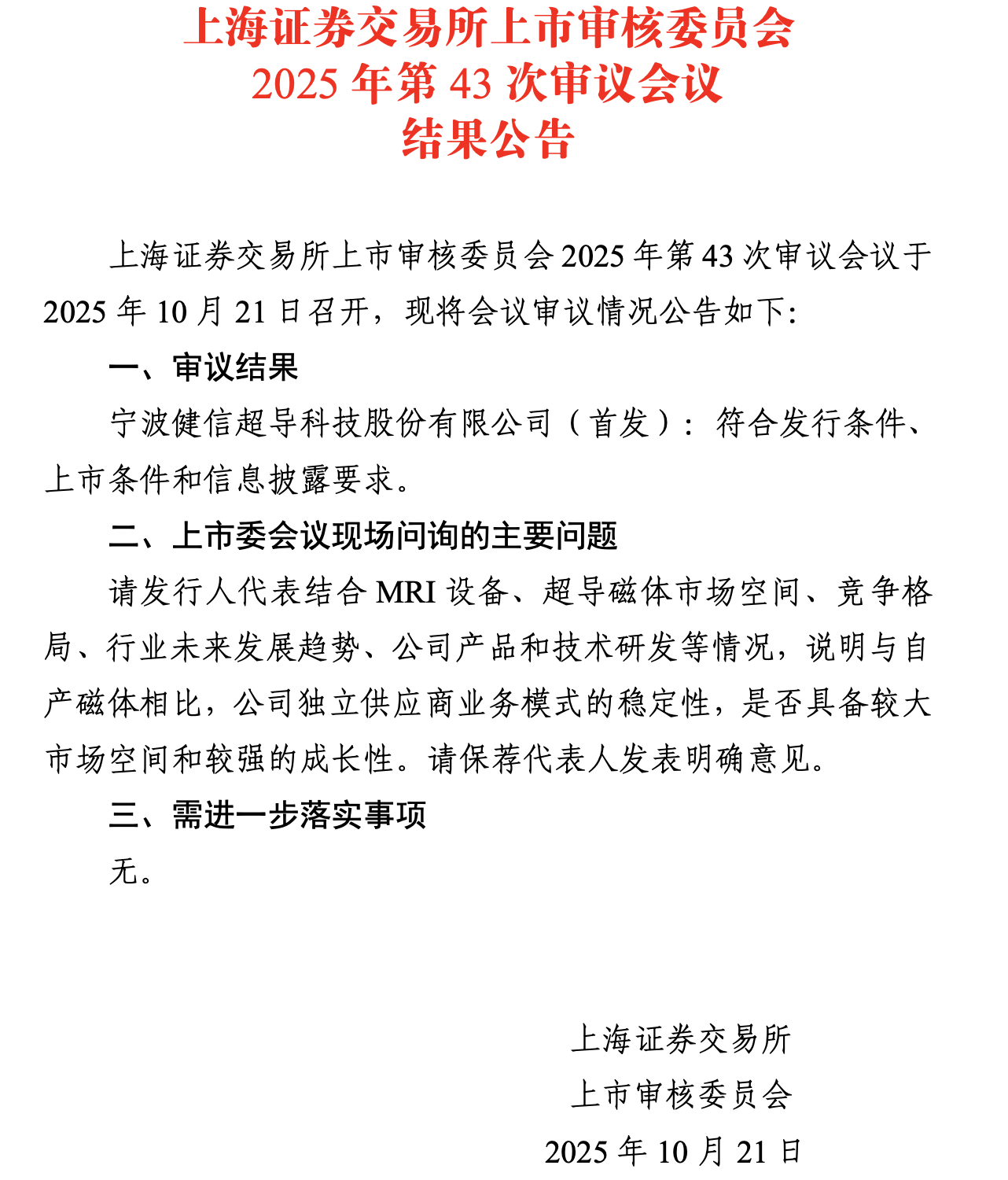 《科创板日报》10月21日讯(记者 黄修眉) 今日(10月21日),上交所上市审核委员会审议并通过了宁波健信超导科技股份有限公司(下称“健信超导”)的科创板IPO申请。该公司科创板IPO申请于2025年5月9日获受理,期间历经两轮审核问询。