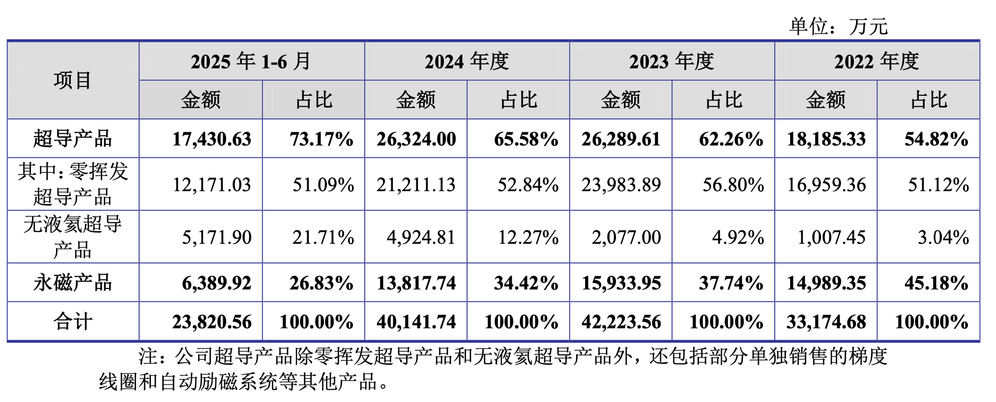 该公司营收分产品看,主要分为超导产品和永磁产品,报告期内超导产品是其第一大主营业务板块。超导产品中,零挥发超导产品又占主要比重。