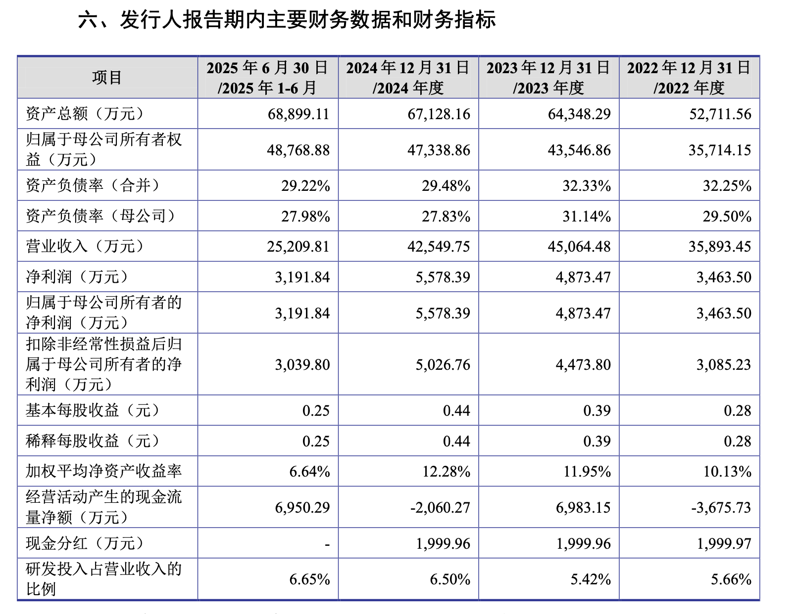 同期的研发投入分别为2033.18万元、2441.93万元、2764.54万元、1675.22万元,占营收比例5.66%、5.42%、6.50%、6.65%。