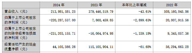 2024年年度报告显示,去年公司实现营业收入2.14亿元,同比下降43.61%;归属于上市公司股东的净利润-2.20亿元,较上年786.85万元下降2,899.63%;归属于上市公司股东的扣除非经常性损益的净利润-2.31亿元,上年为-1606.50万元;经营活动产生的现金流量净额为4410.56万元,同比下降61.68%。