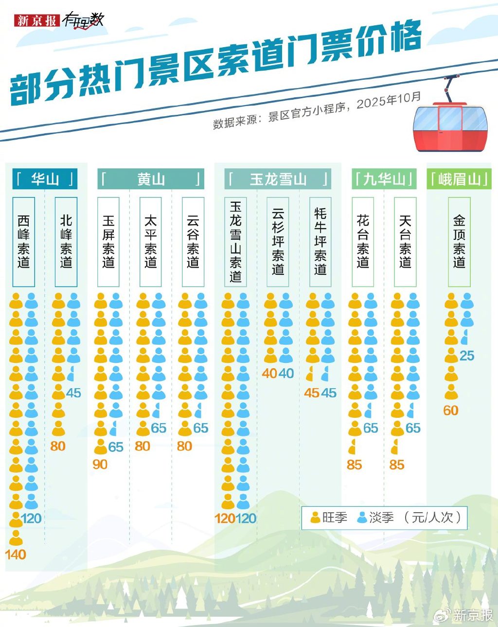 我们观察了国内比较有名的景区索道单趟价格,发现华山西峰索道旺季要140元一人次,是几个名山中最贵的;峨眉山金顶索道淡季25元一人次,相对亲民便宜些。