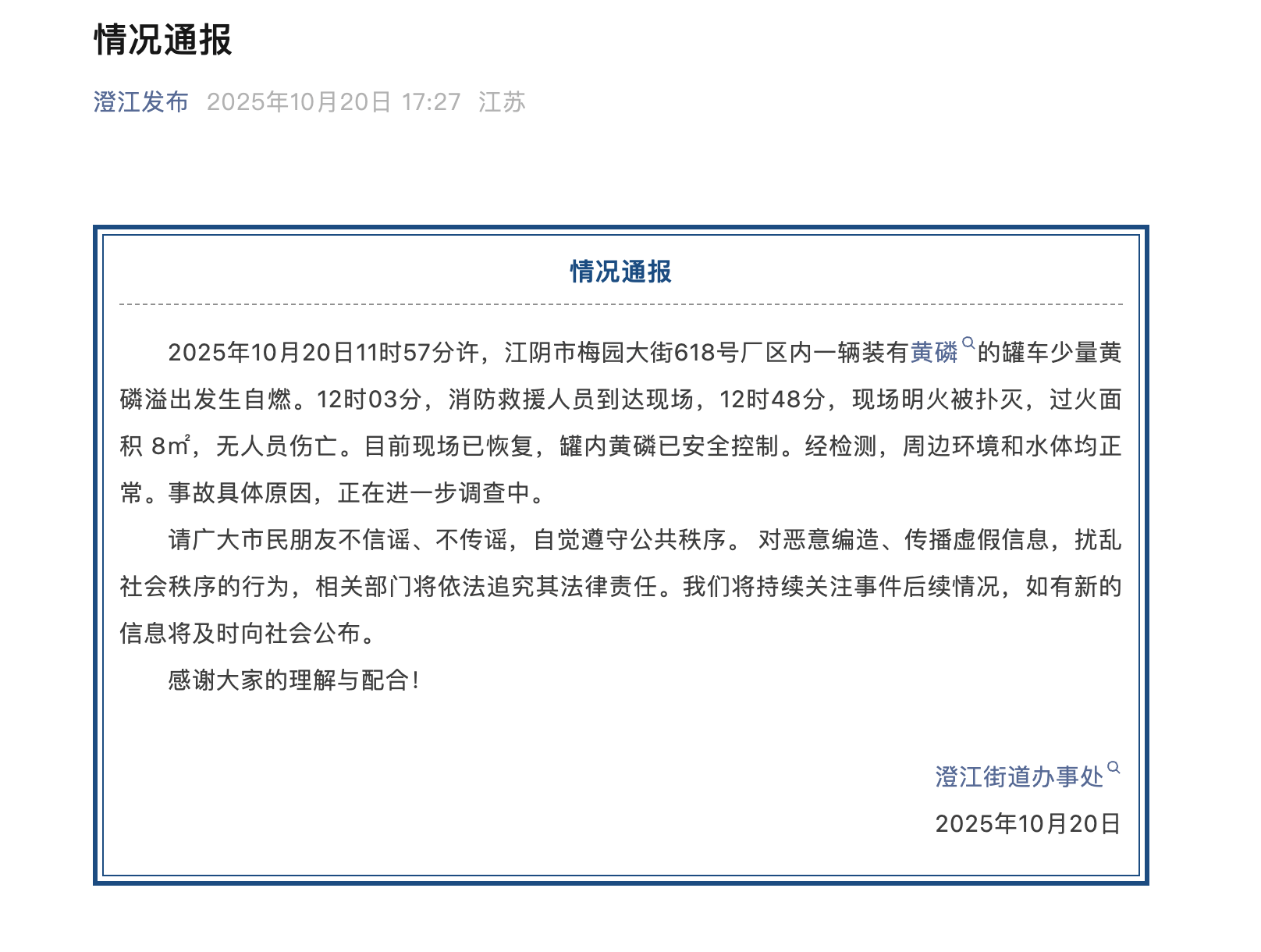10月20日17时30分左右,澄江街道办事处发布情况通报:10月20日11时57分许,江阴市梅园大街618号厂区内一辆装有黄磷的罐车有少量黄磷溢出发生自燃。12时03分,消防救援人员到达现场,12时48分,现场明火被扑灭,过火面积8㎡,无人员伤亡。目前现场已恢复,罐内黄磷已安全控制。经检测,周边环境和水体均正常。