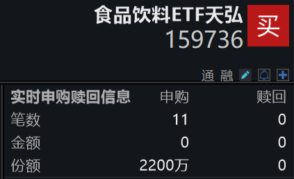 值得一提的是,食品饮料ETF天弘(159736)盘中再获资金逆市布局,截至目前,该基金净申购份额已达2200万份。