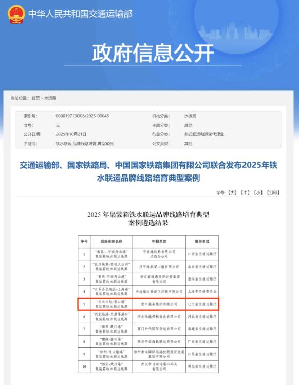 “东北内陆—营口港”集装箱铁水联运线路入选