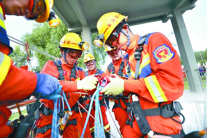 “要提前把绳子捋好,找好绳头,这样可以节省时间。”国家矿山应急救援兵团队的队员一边旁观竖井提升项目其他组的比赛,一边总结经验、调整接下来的技术动作。