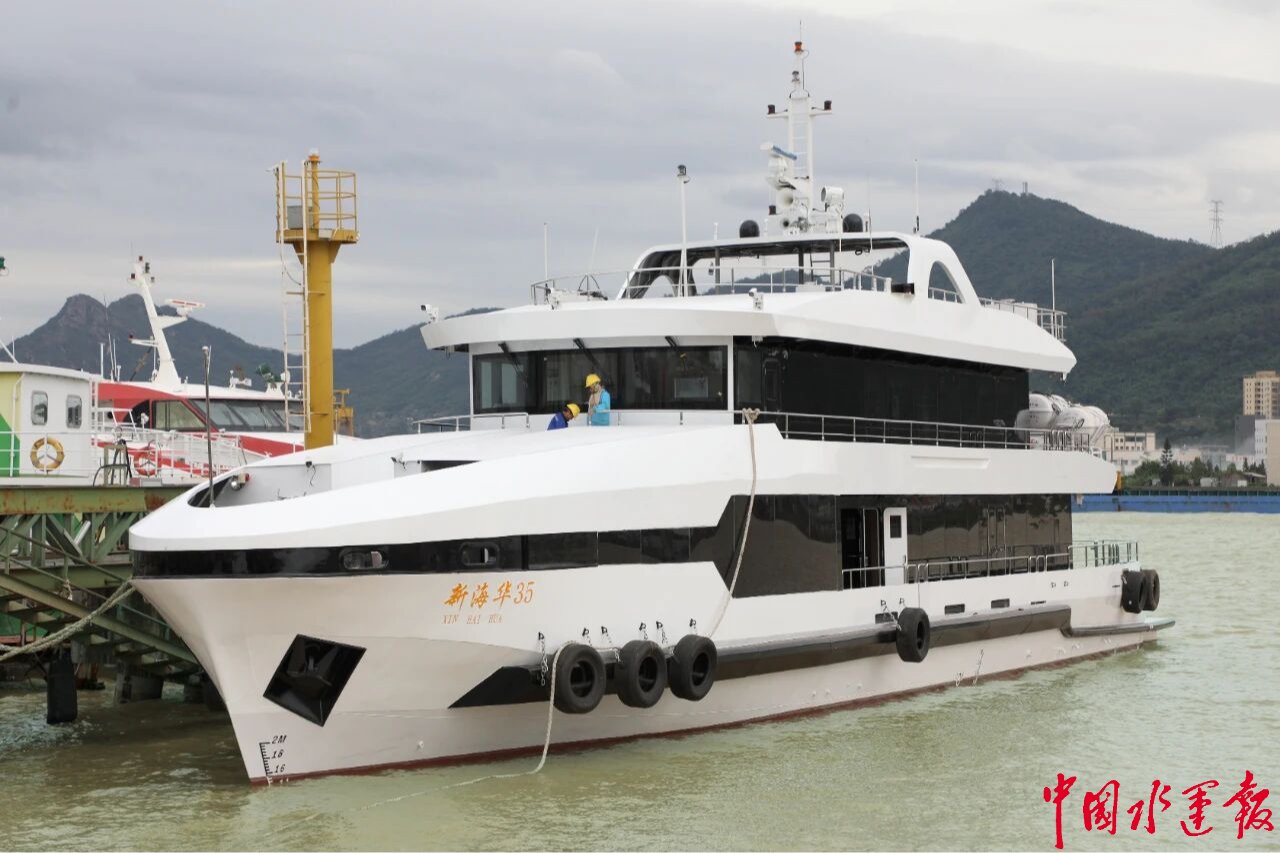 此次吉水的“新海华89”延续高端品质基因,采用钢铝复合结构打造,总长38.0米,型宽6.8米,型深2.85米,凭借双机双桨推进系统实现不小于17.8节的设计航速,在高效性与稳定性上形成完美平衡。船艇以豪华游艇外型为设计核心,大面积玻璃幕墙的创新应用营造出开阔通透的观景视野,将客运交通与旅游观光功能深度融合,为普陀山游客打造“乘船即观光”的高端出行体验,精准契合舟山“蓝色岛链”工程对品质客船的升级需求。