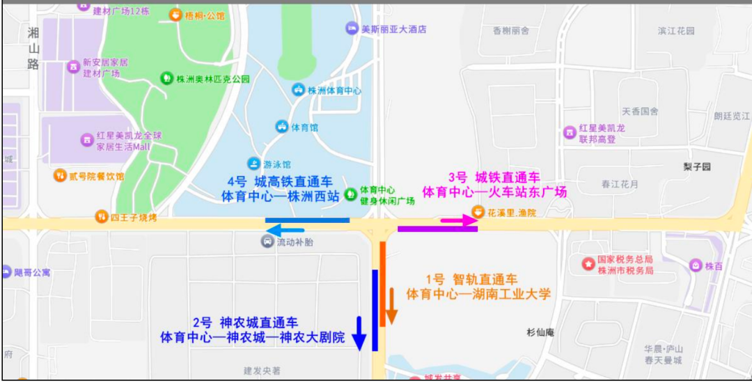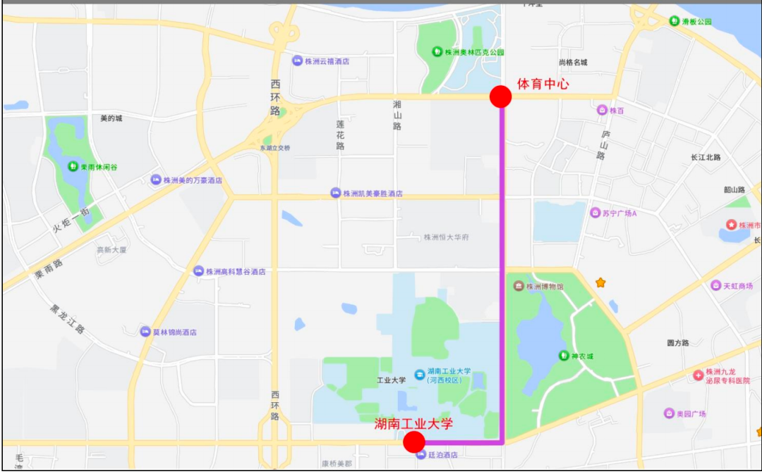 行驶路线:株洲西站—炎帝大道—栗雨南路—高新大道—珠江北路—株洲大道—体育中心