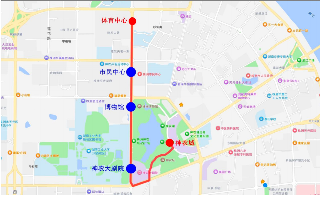 沿线停靠站点:神农城(天易集团)、神农大剧院、株洲博物馆、市民中心、体育中心