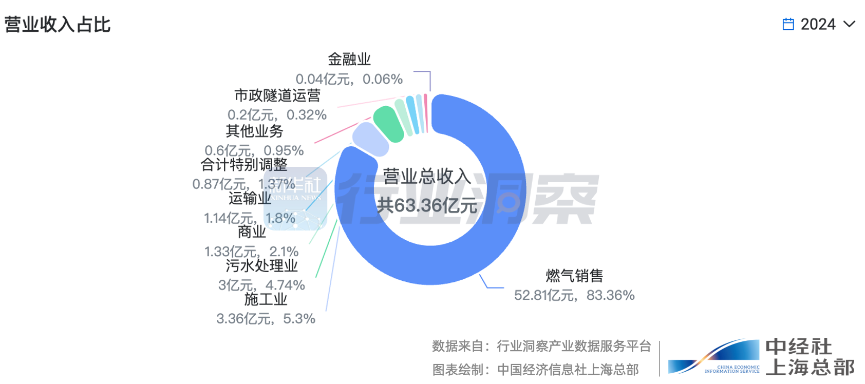 中经社行业洞察产业服务数据平台(简称“行业洞察系统”)显示,从2024年年报来看,燃气销售收入占据大众公用总营收的83.36%,是绝对大头;而施工业、污水处理业等环境市政业务收入亦颇为可观,但金融业收入占营收比重较低。