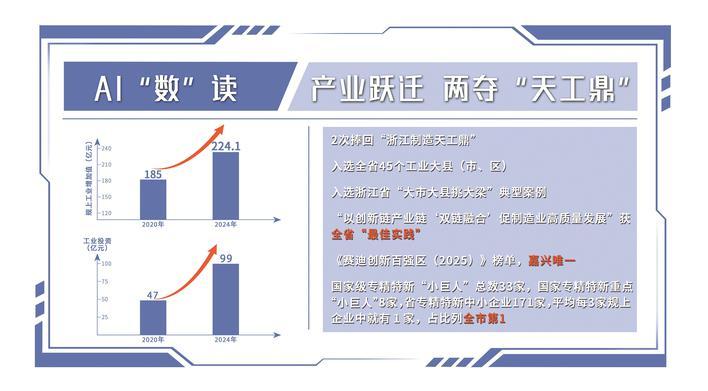 五年产业之变,最终沉淀为沉甸甸的发展成果与荣誉认可。除2次捧回“浙江制造天工鼎”外,南湖区稳居全省45个工业大县(市、区)之列,2024年入选浙江省“大市大县挑大梁”典型案例,“以创新链产业链‘双链融合’促制造业高质量发展”获评2023年度全省“最佳实践”。在赛迪顾问发布的《赛迪创新百强区(2025)》榜单中,南湖区成为嘉兴唯一入选的县(市、区),创新已成为南湖区最鲜明的城市标签。