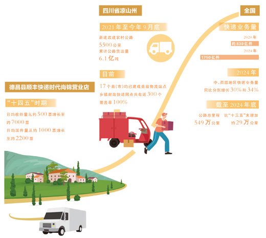 距离京昆高速路口不远处,德昌县顺丰快递时代尚锦营业店里,货车引擎声与包裹扫码声交织在一起。“十四五”时期,这家快递站的日均收件量从约500票增长至约7000票,派件量、工作人员数量成倍增长。曾经的小站点,如今已成长为繁忙的地区物流枢纽。