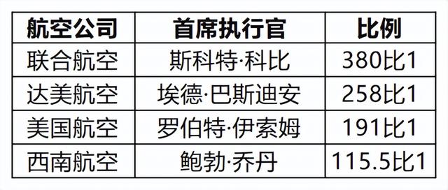 美国四大航空公司首席执行官与普通员工的薪酬比率