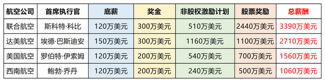 从底薪来看,四大航空公司首席执行官的底薪大多在120万美元至150万美元之间,相对较为稳定。