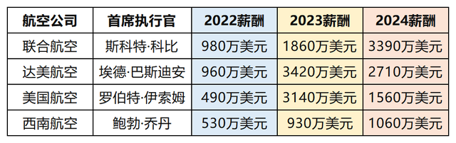2024年度美国四大航总裁薪水构成